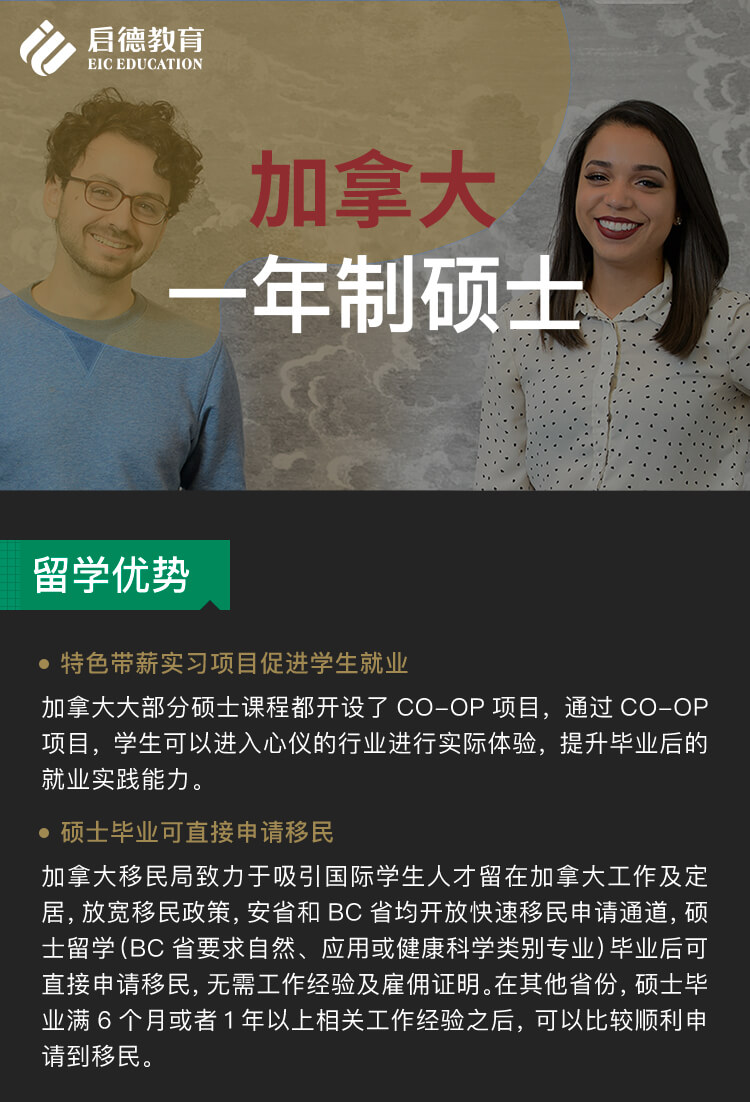 加拿大移民局致力于吸引国际学生人才留在加拿大工作及定居,放宽移民政策,安省和BC省均开放快速移民申请通道,硕士留学(BC省要求自然、应用或健康科学类别专业)毕业后可直接申请移民,无需工作经验及雇佣证明。在其他省份,硕士毕业满6个月或者1年以上相关工作经验之后,可以比较顺利申请到移民。