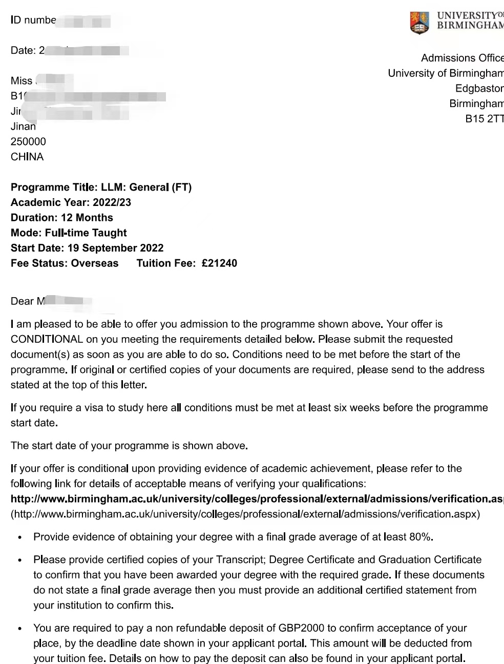 录取院校:伯明翰大学