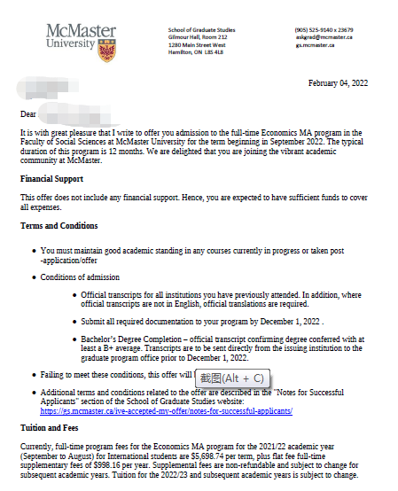 录取院校:麦克马斯特大学