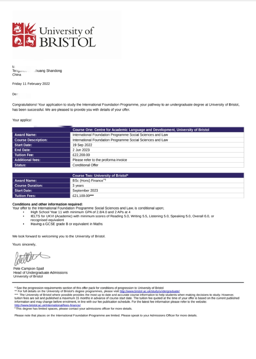 录取院校:布里斯托大学
