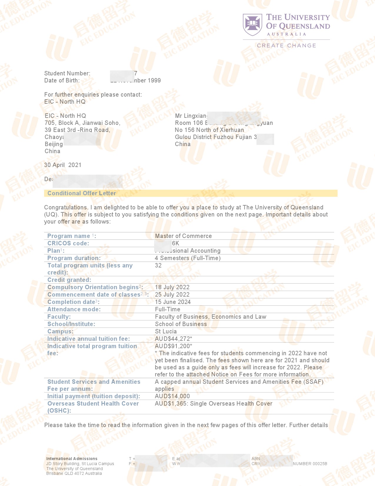 录取专业:Master of Commerce (Professional Accounting)