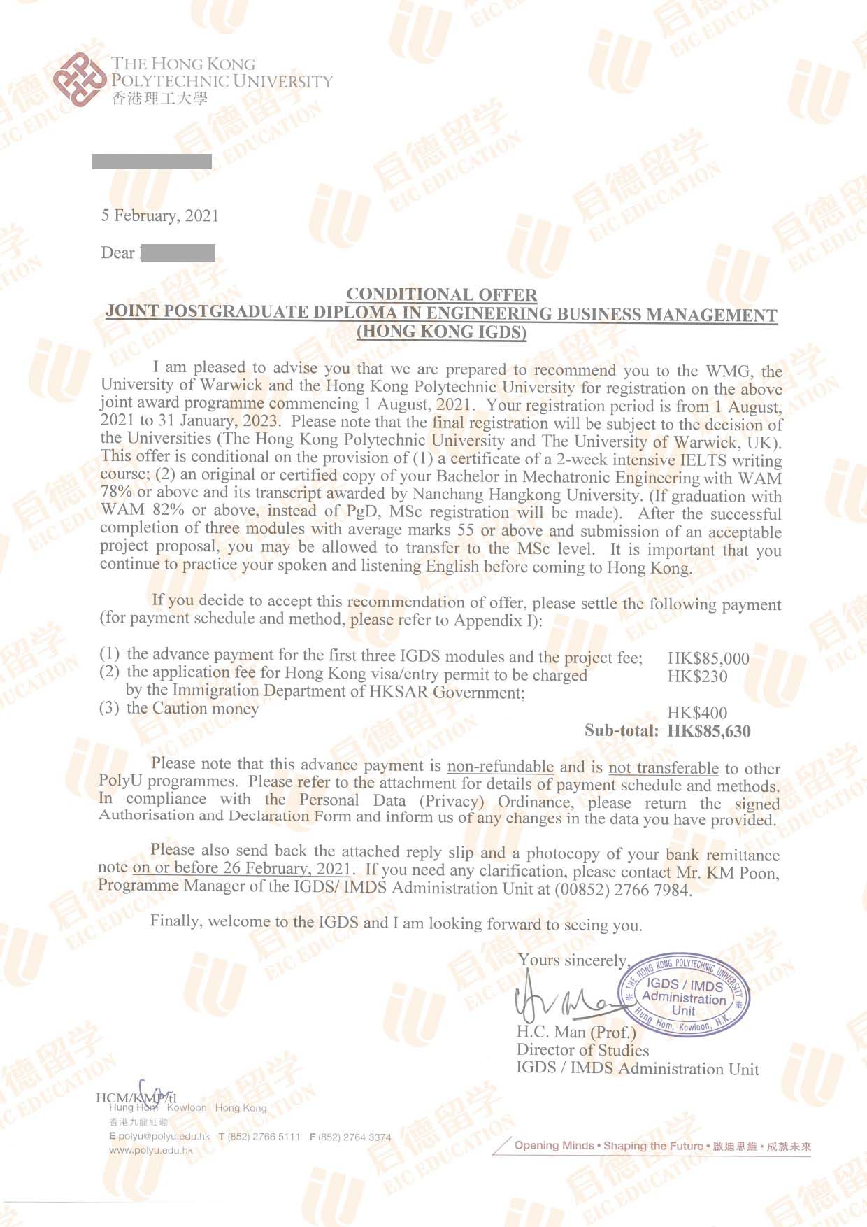 录取院校:香港理工大学