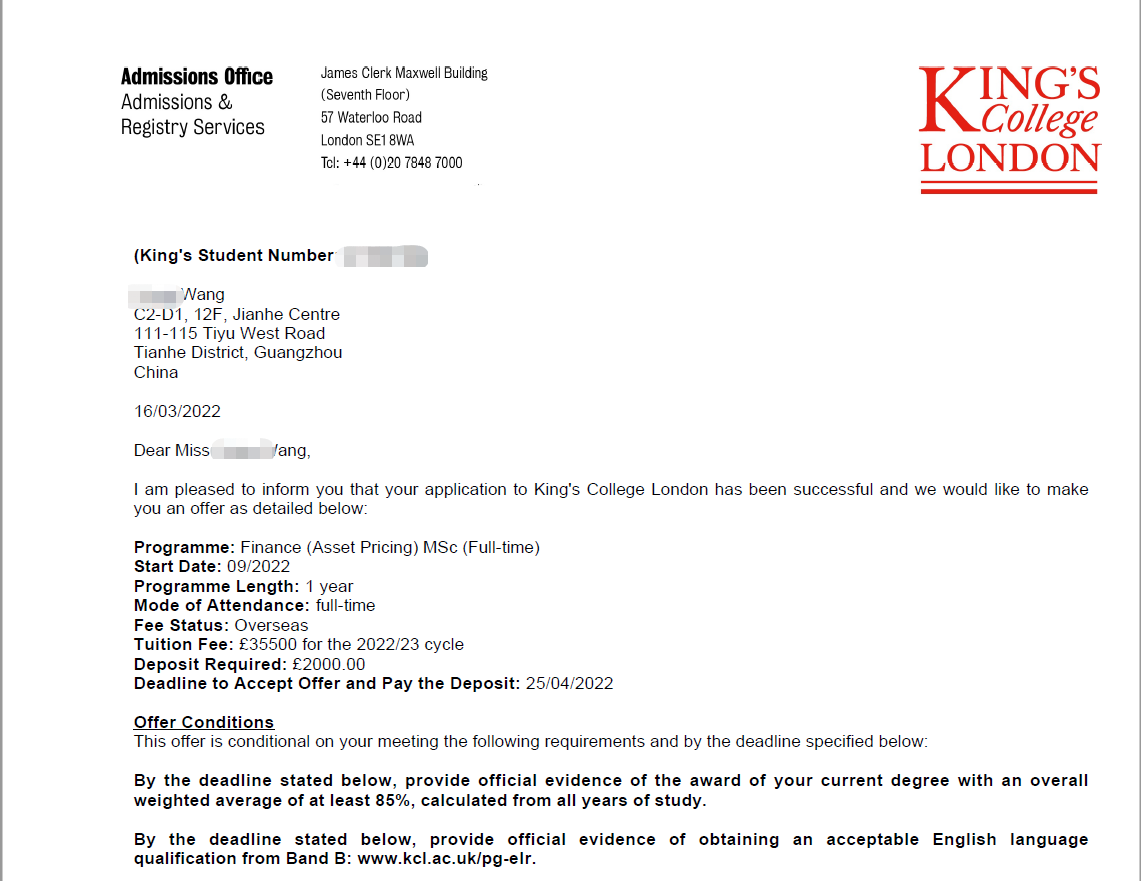 录取专业:MSc Finance (Asset Pricing)