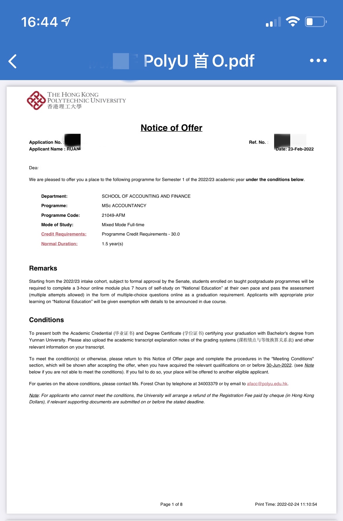 录取院校:香港理工大学
