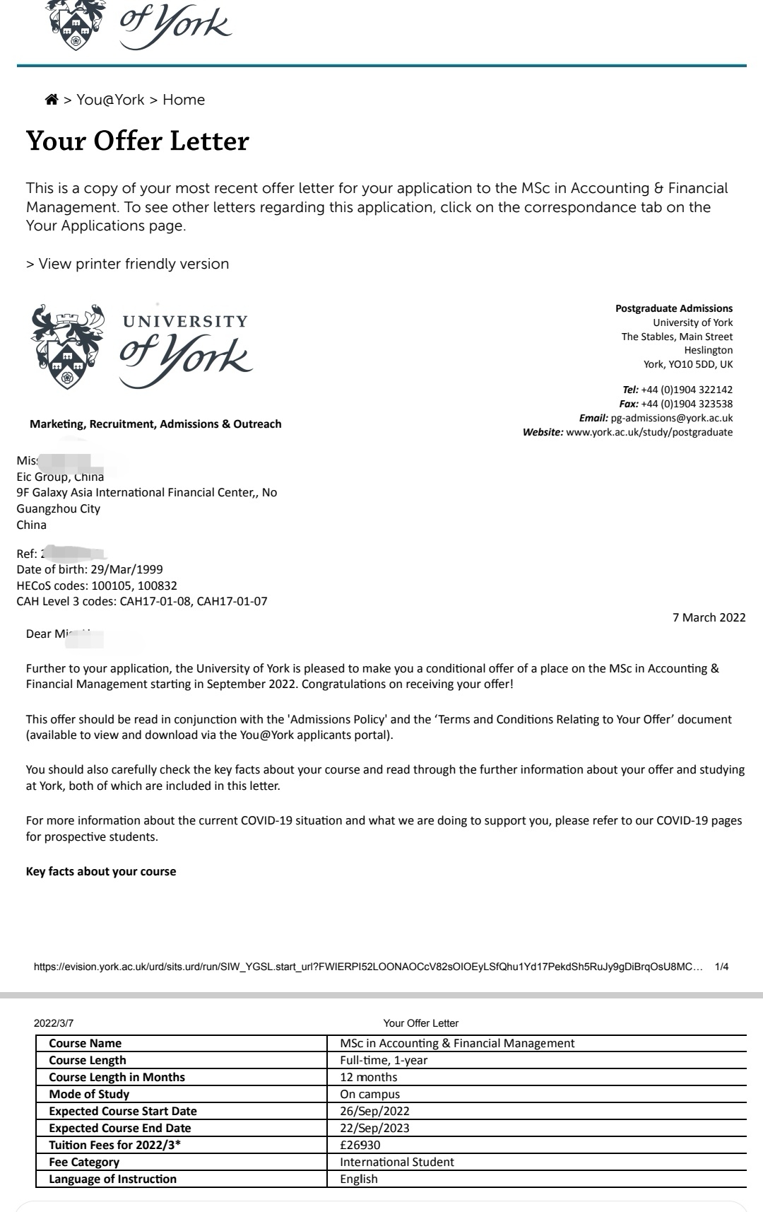 录取院校:约克大学