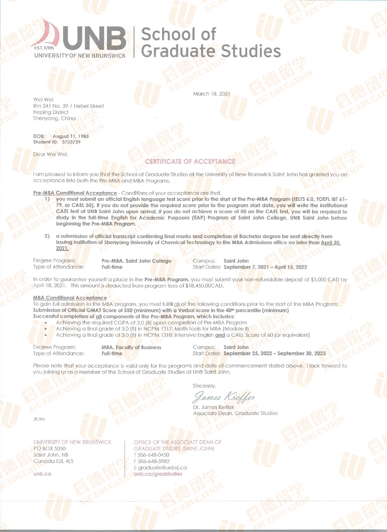 录取专业:MBA (Master of Business Administration) in Business - Saint John