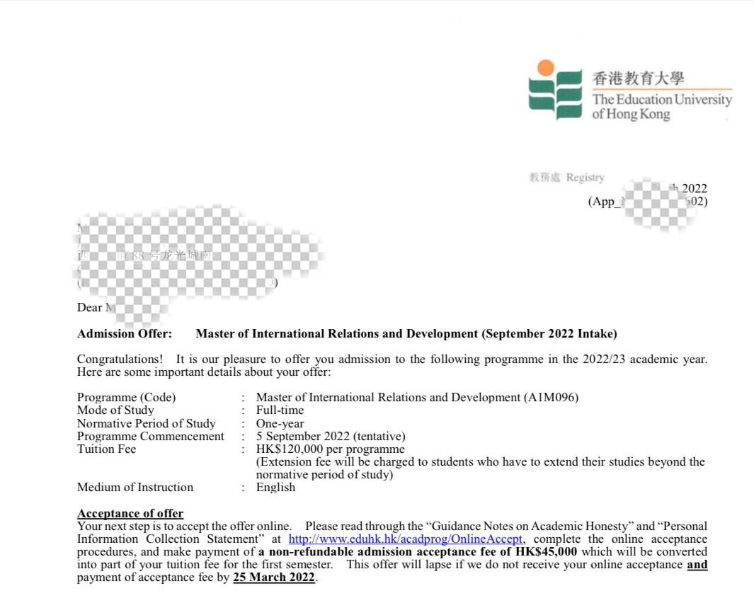 录取专业:Master of International Relations and Development