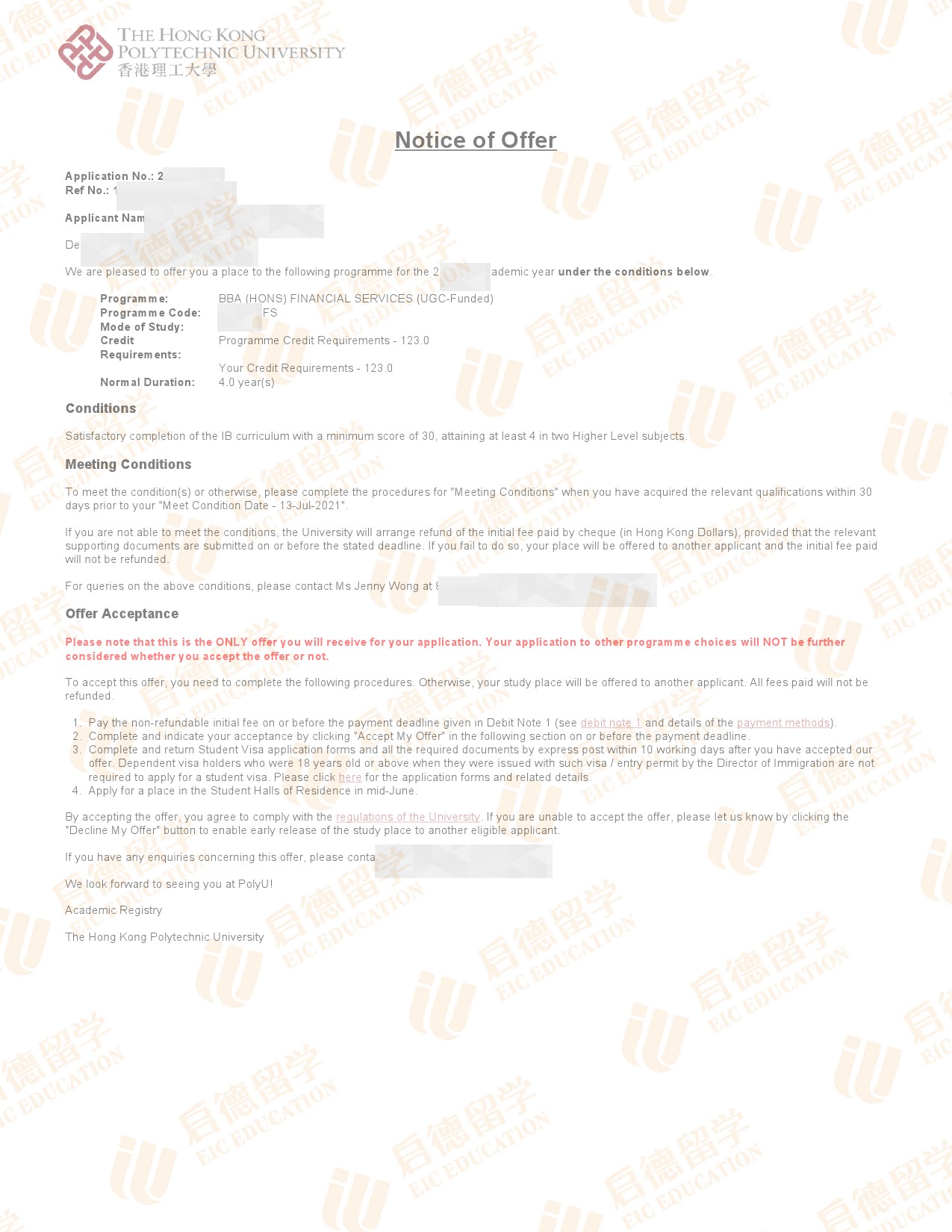 录取专业:BBA(Hons) in Financial Services