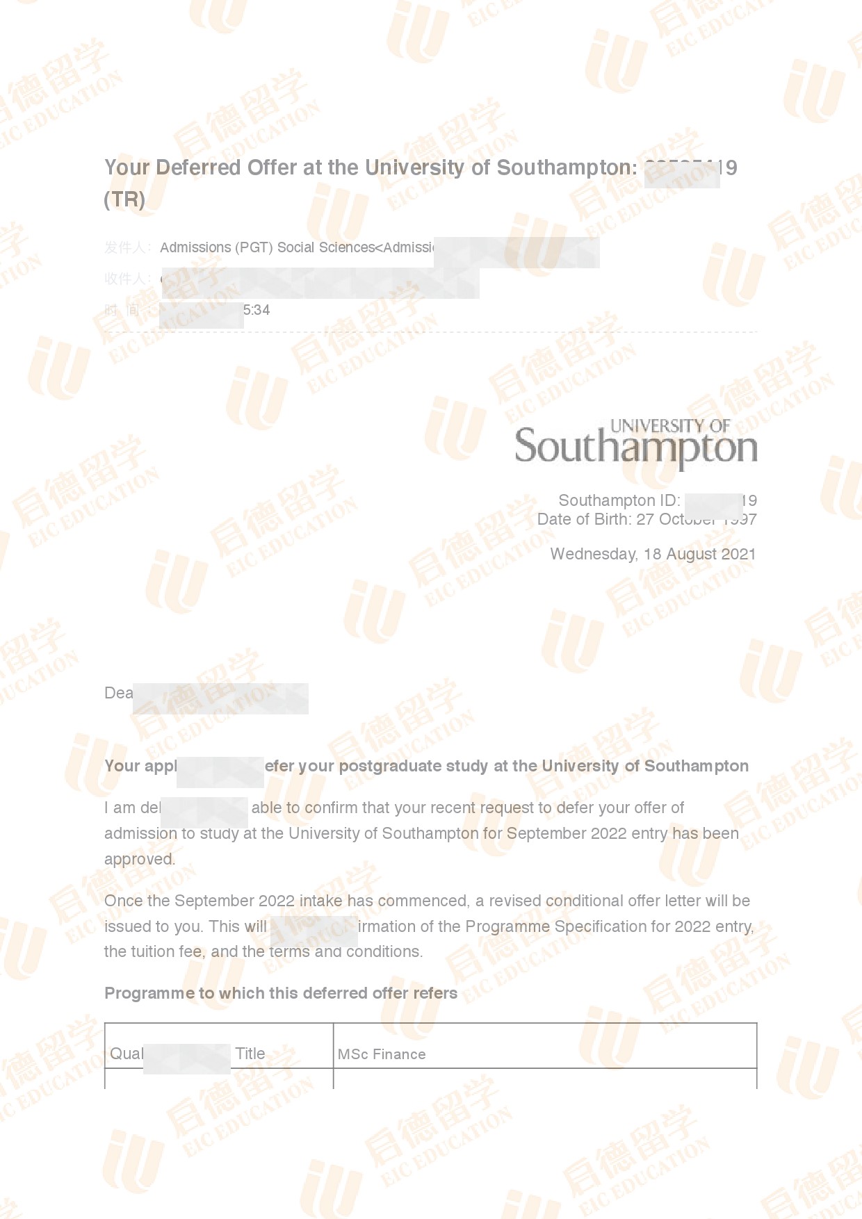 录取院校:南安普顿大学