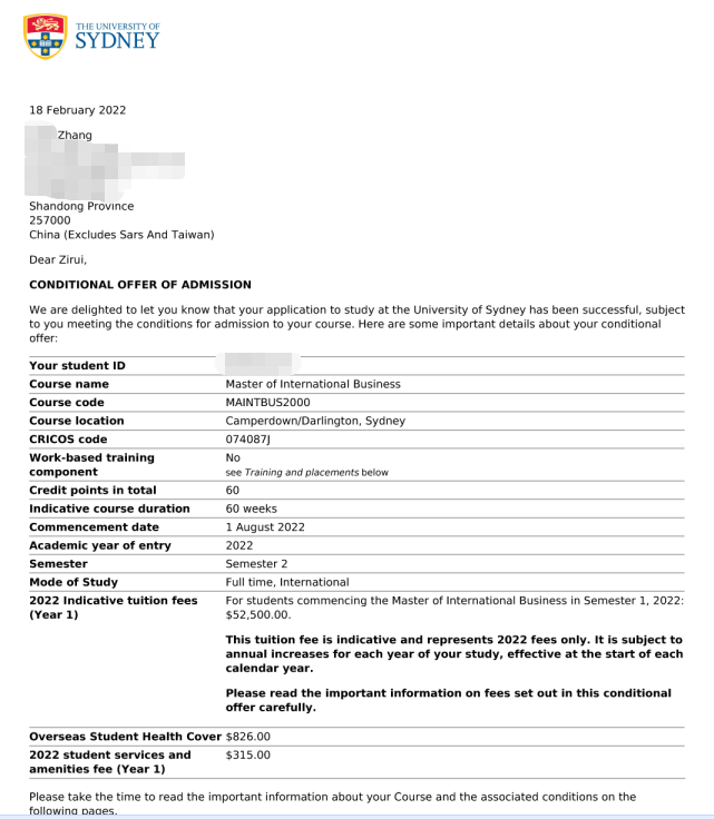 录取院校:悉尼大学