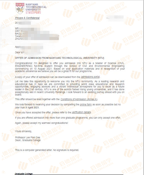 录取院校:新加坡南洋理工大学