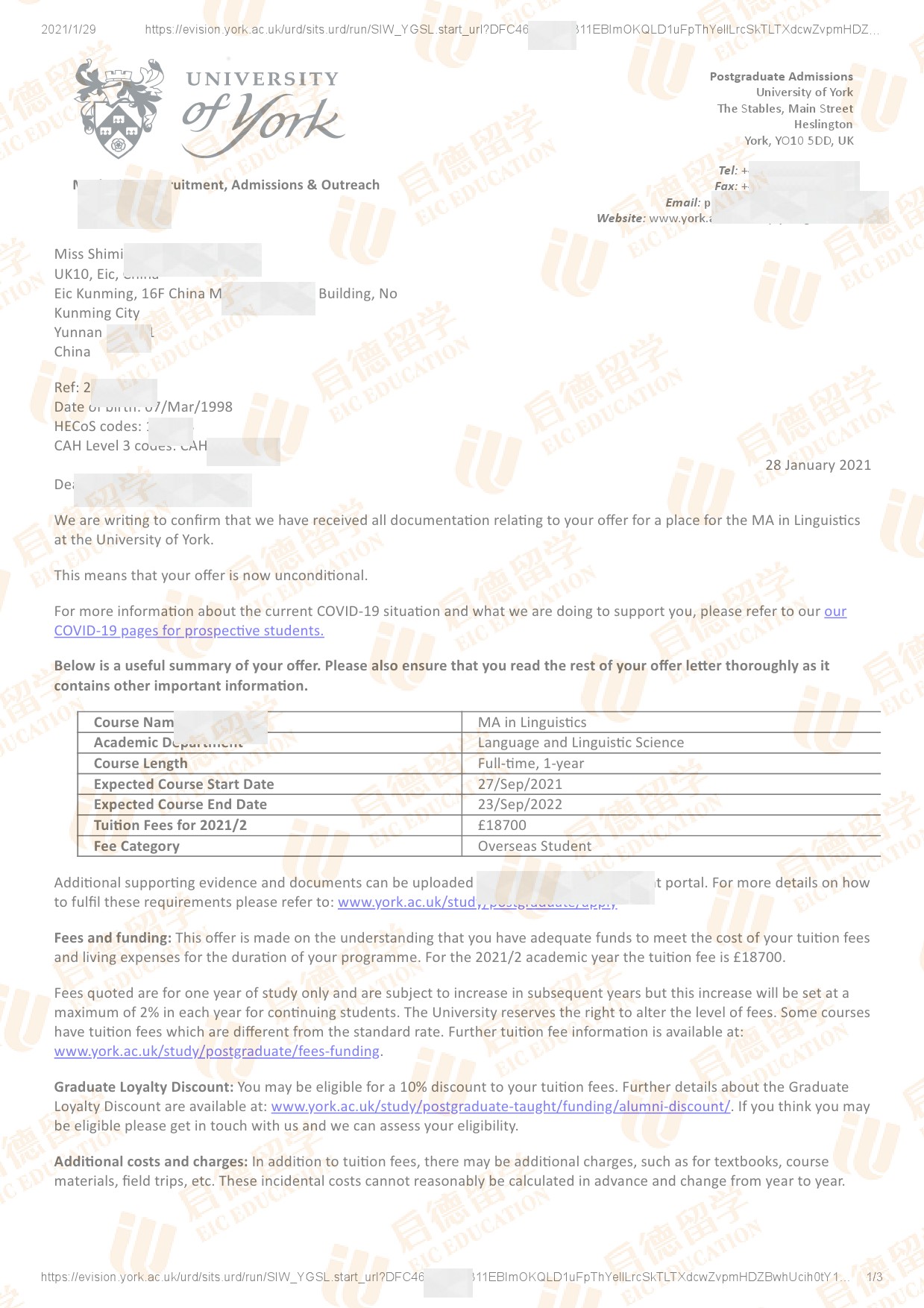 录取院校:约克大学