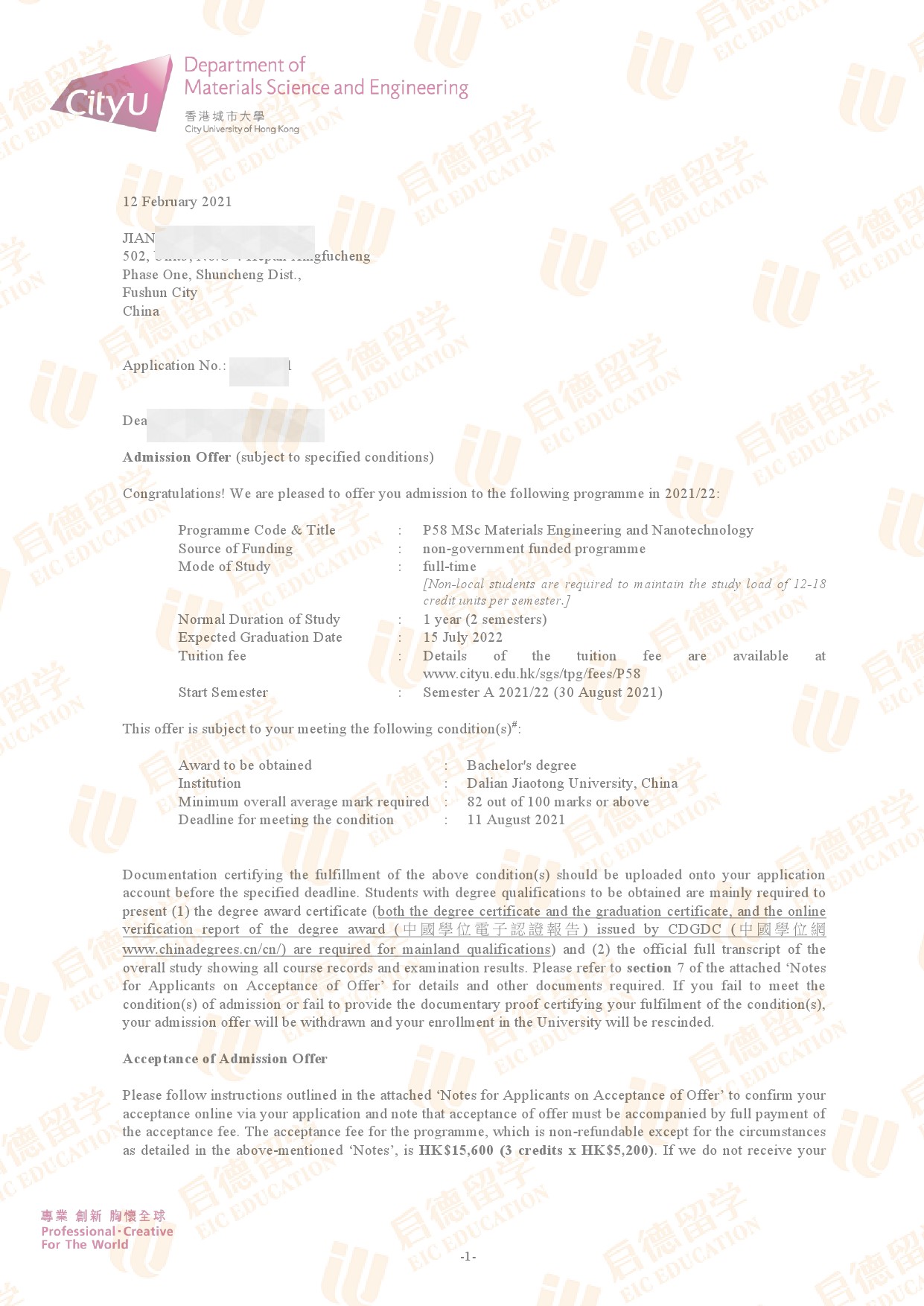 录取院校:香港城市大学