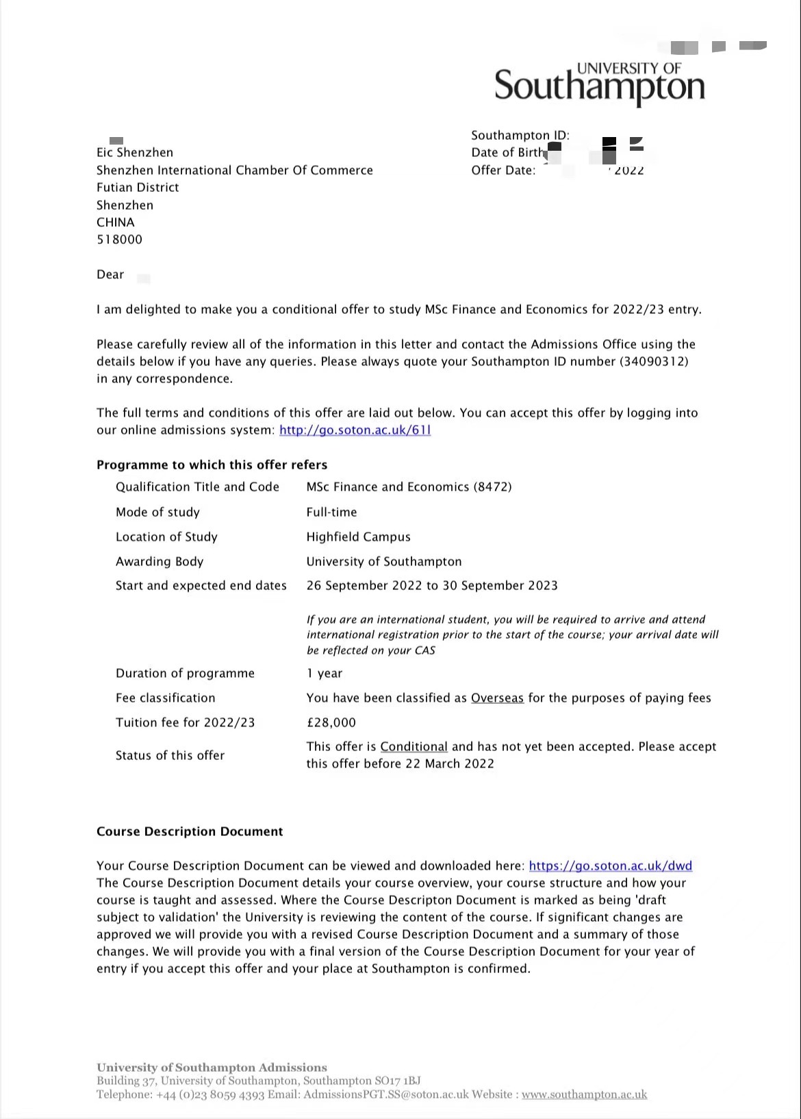 录取院校:南安普顿大学