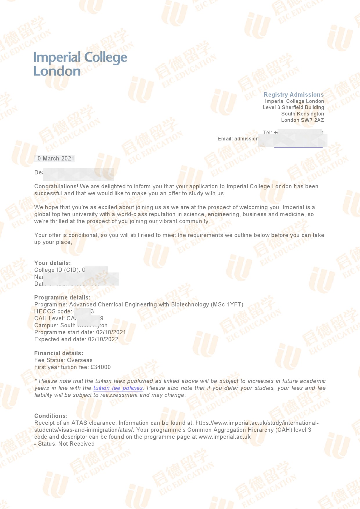 录取专业:MSc Advanced Chemical Engineering with Biotechnology
