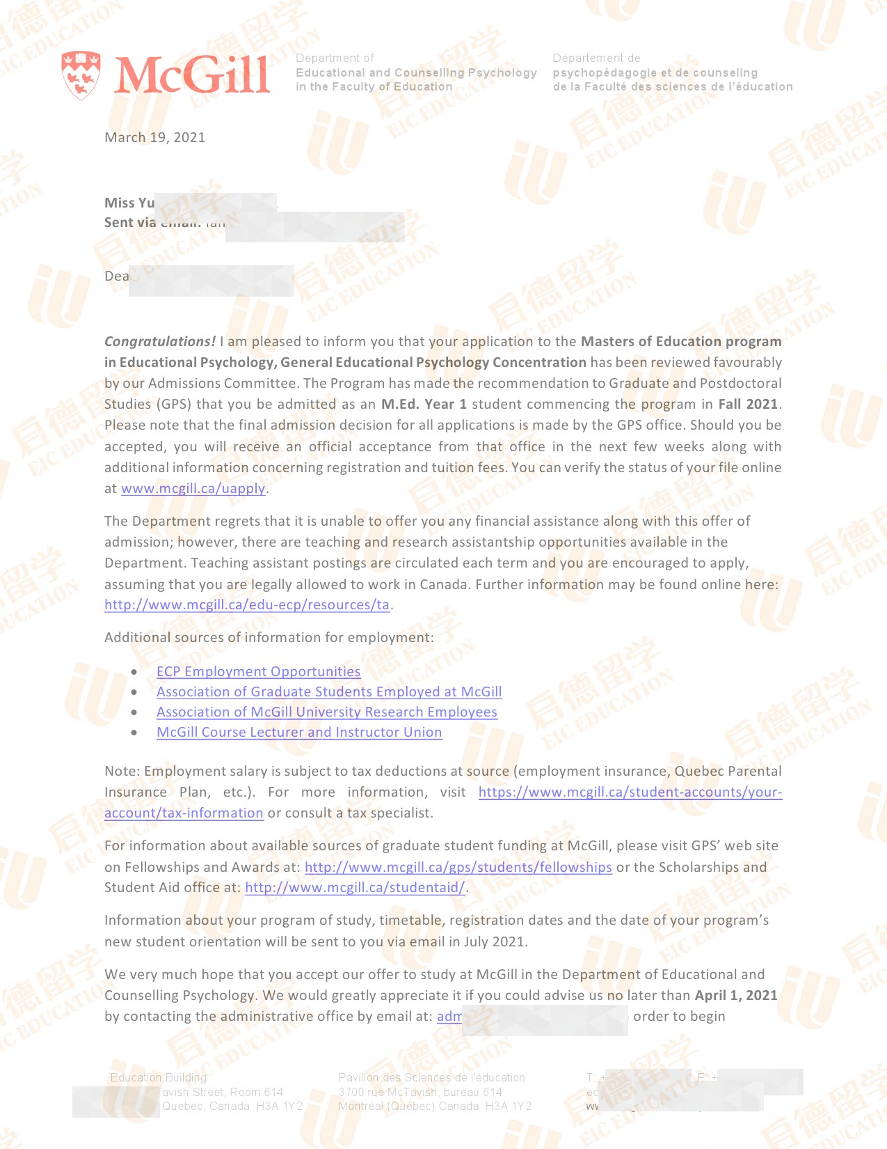 录取专业:Master of Education (M.Ed.) Educational Psychology (Non-Thesis): General Educational Psychology (48 credits)