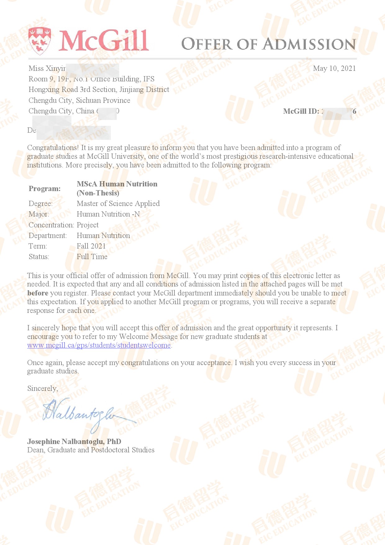 录取专业:Master of Science, Applied (M.Sc.A.) Human Nutrition (Non-Thesis): Practicum (45 credits)