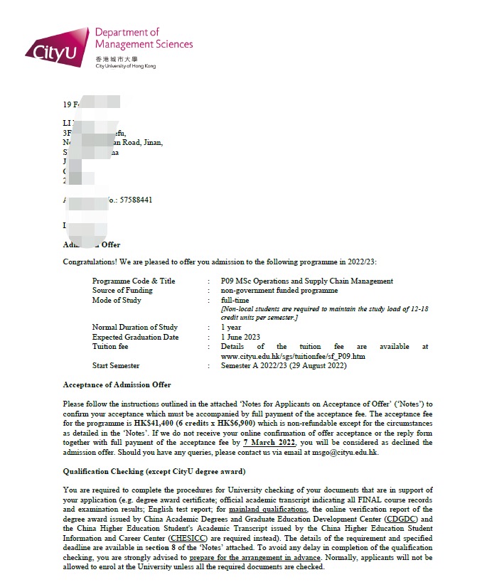 录取院校:香港城市大学