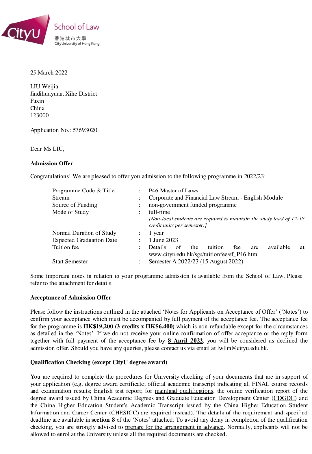录取专业:Master of Laws (Corporate and Financial Law Stream)