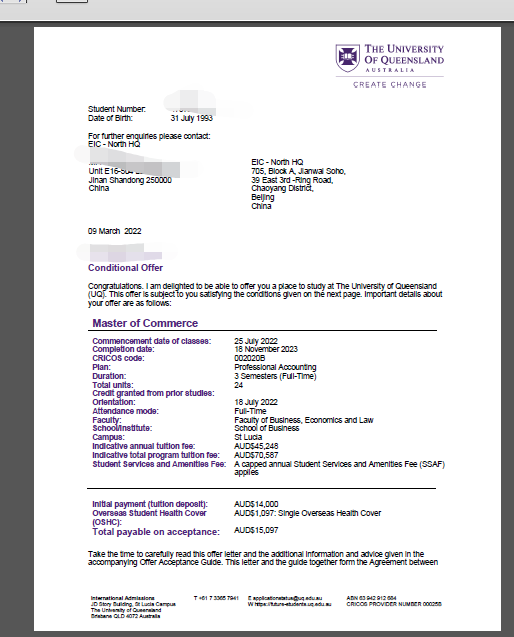 录取专业:Master of Commerce (Professional Accounting)