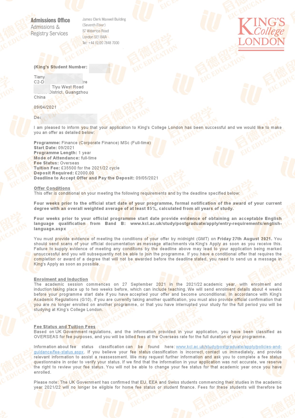 录取专业:MSc Finance (Corporate Finance)
