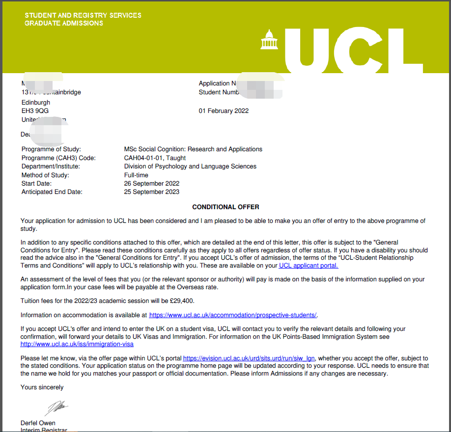 录取院校:伦敦大学学院