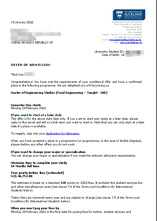 录取国家/地区:新西兰
