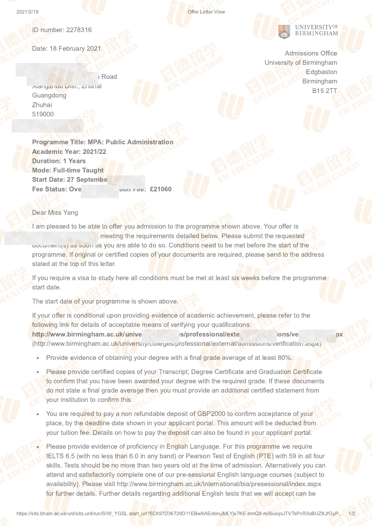 录取院校:伯明翰大学