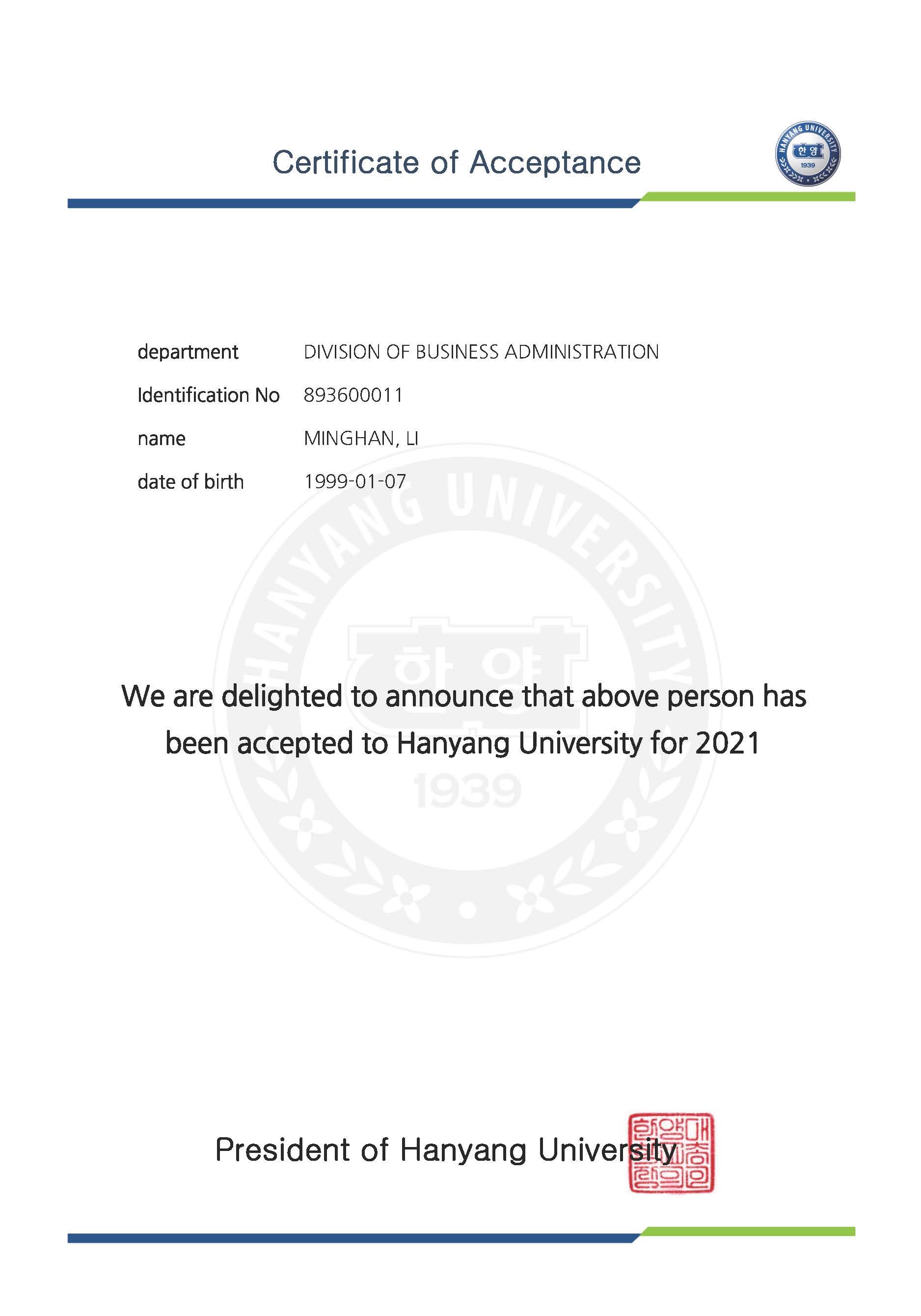 录取院校:汉阳大学-首尔校区