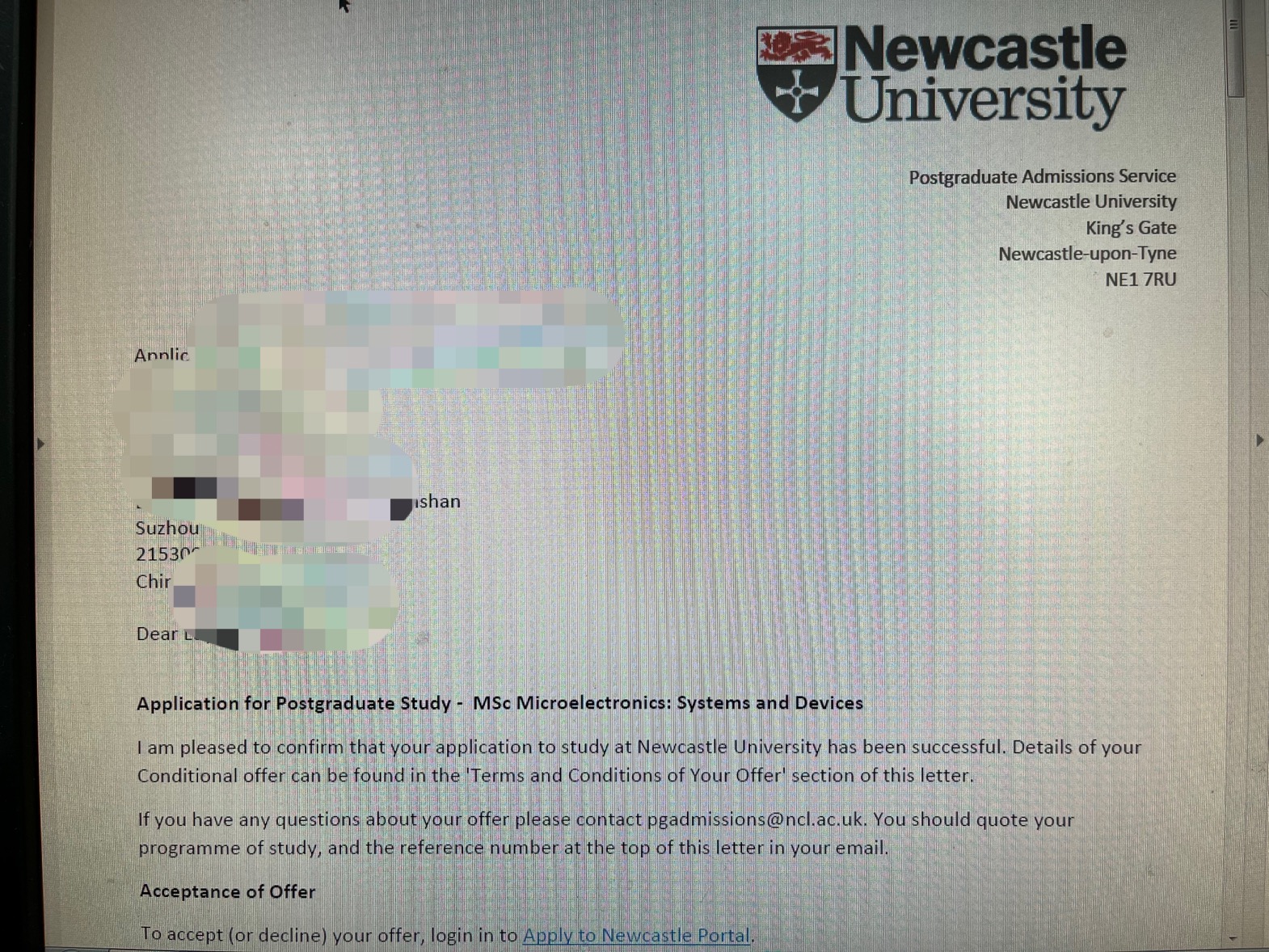录取院校:纽卡斯尔大学