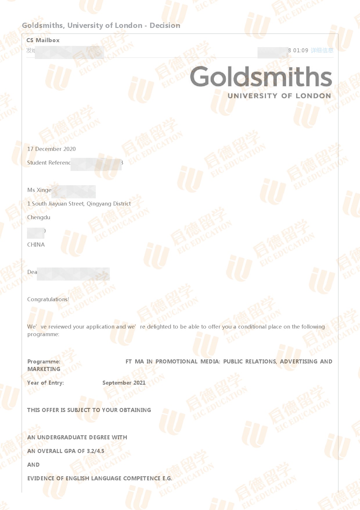 录取专业:MA Promotional Media: Public Relations, Advertising & Marketing