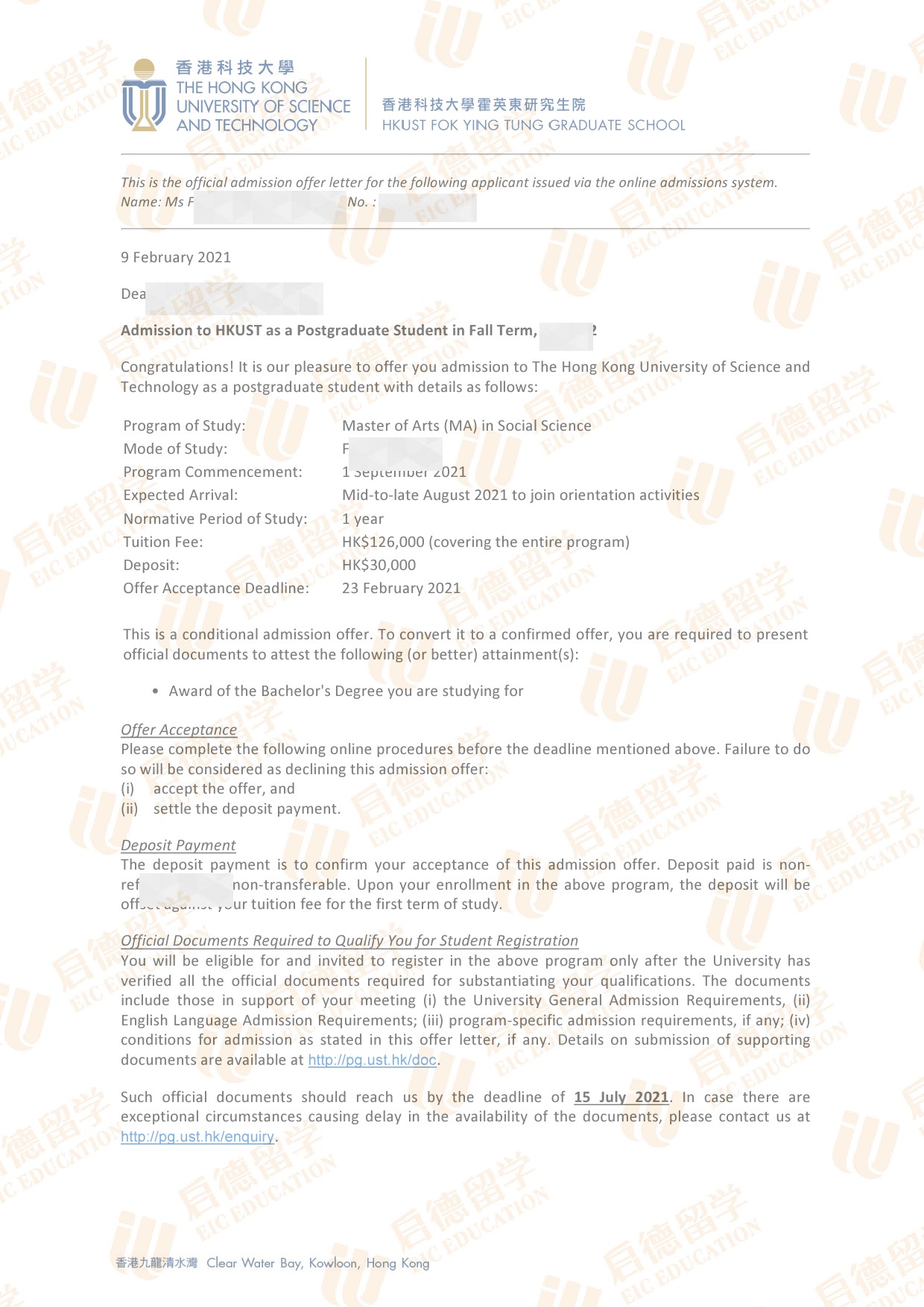 录取院校:香港科技大学