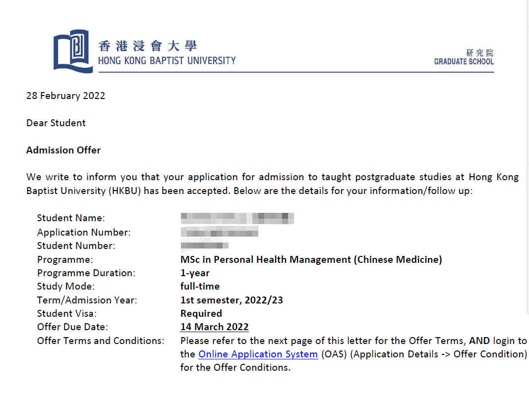 录取专业:Master of Science in Personal Health Management (Chinese Medicine)