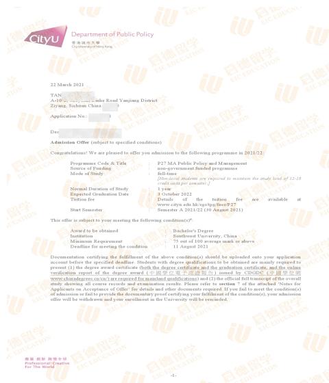 录取院校:香港城市大学