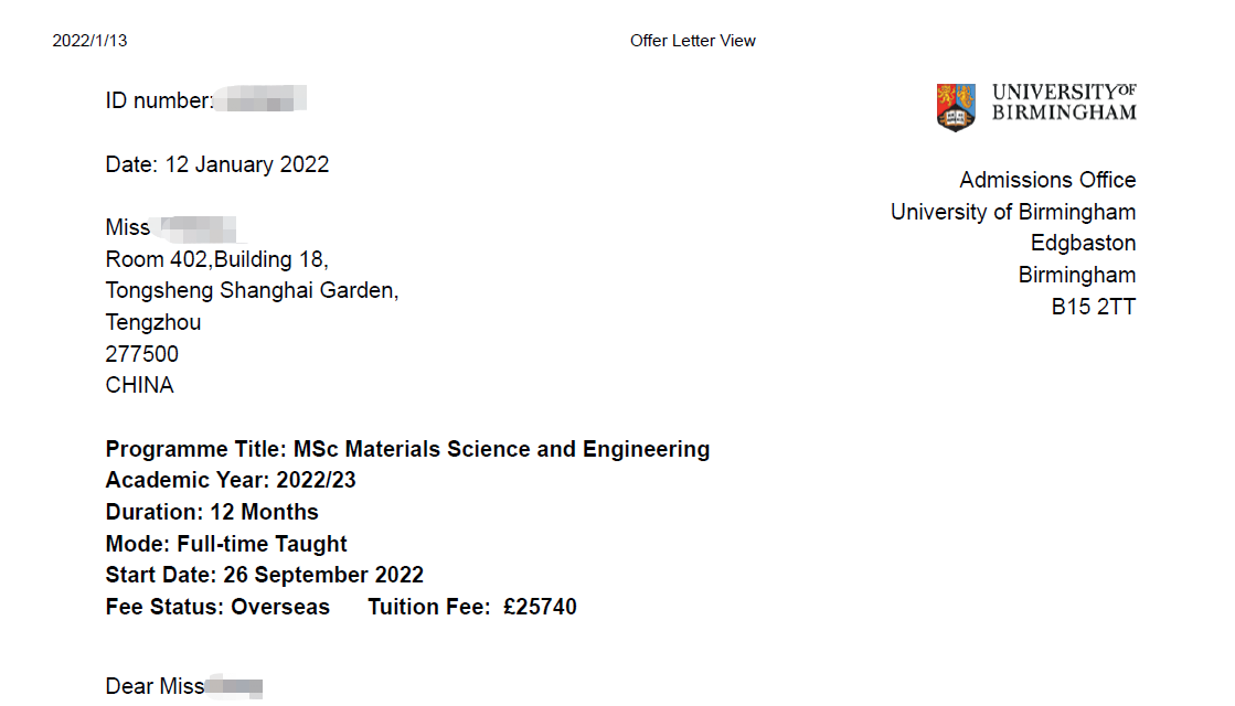 录取院校:伯明翰大学