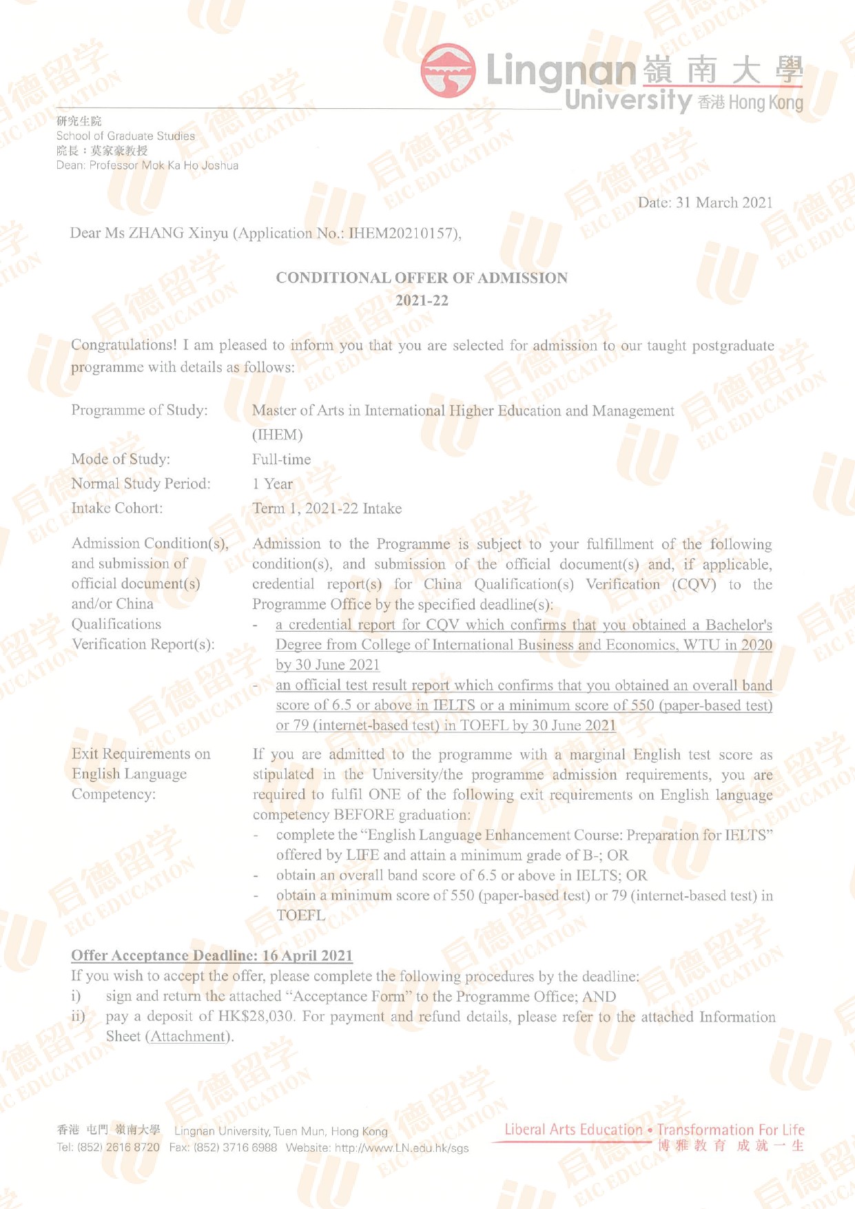 录取院校:香港岭南大学