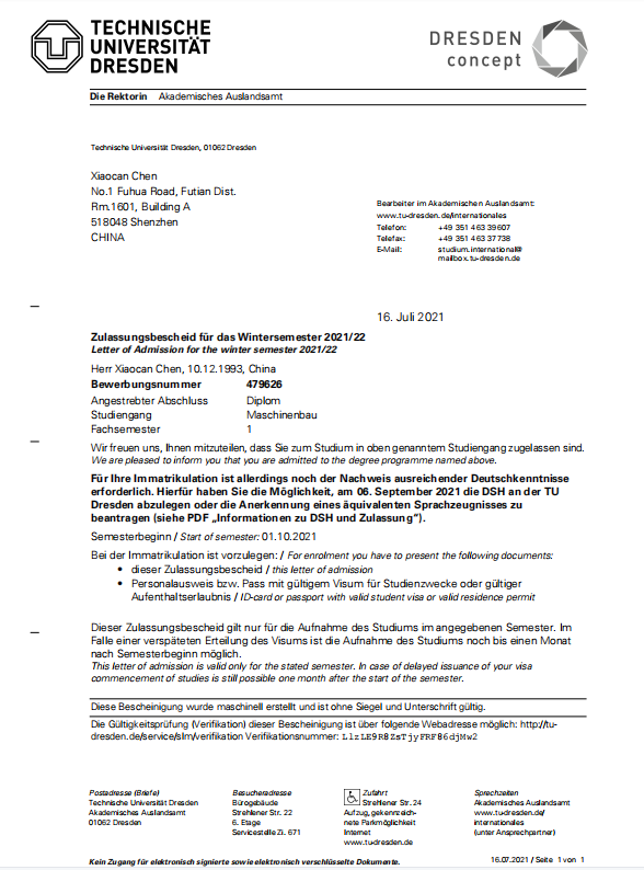 录取院校:德累斯顿工业大学