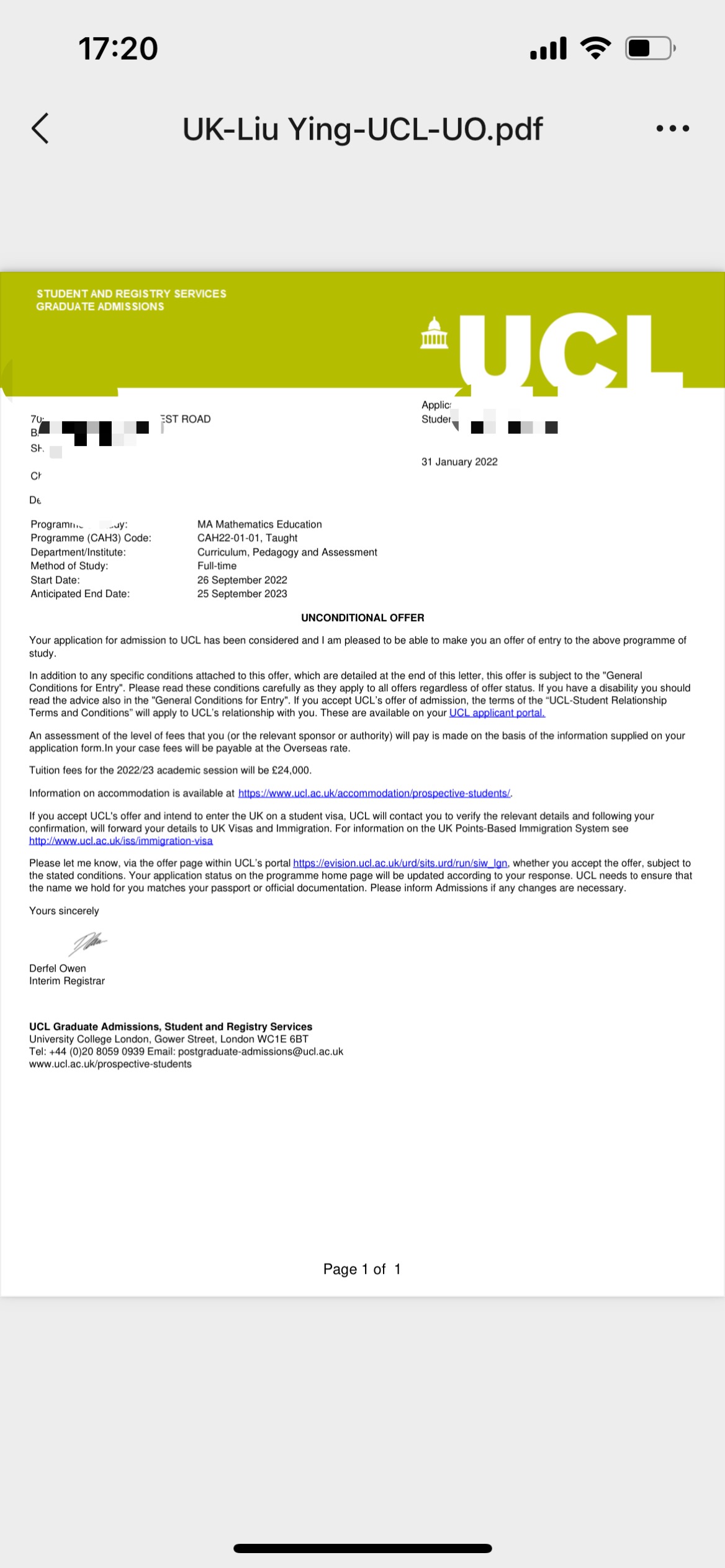 录取院校:伦敦大学学院