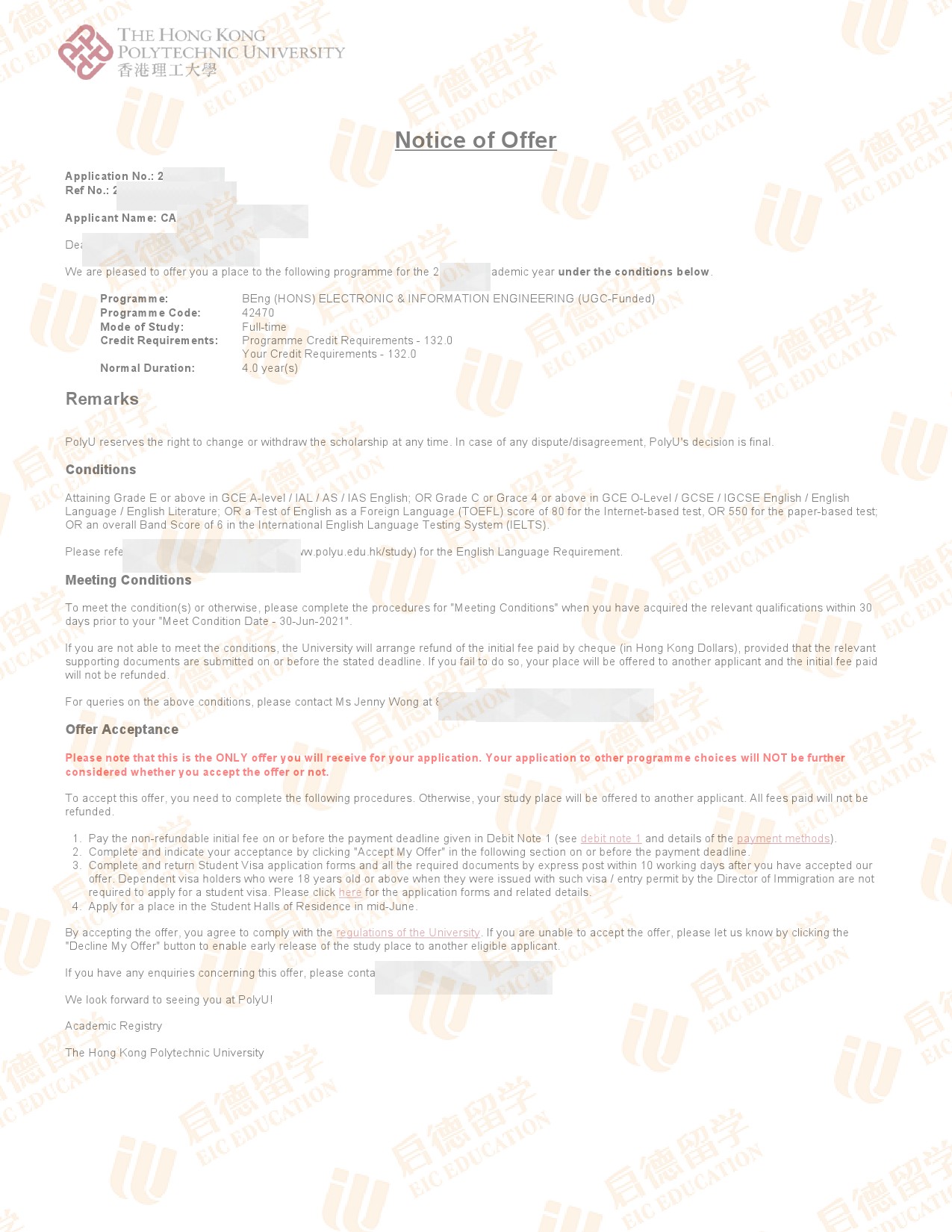 录取专业:BEng(Hons) in Electronic and Information Engineering