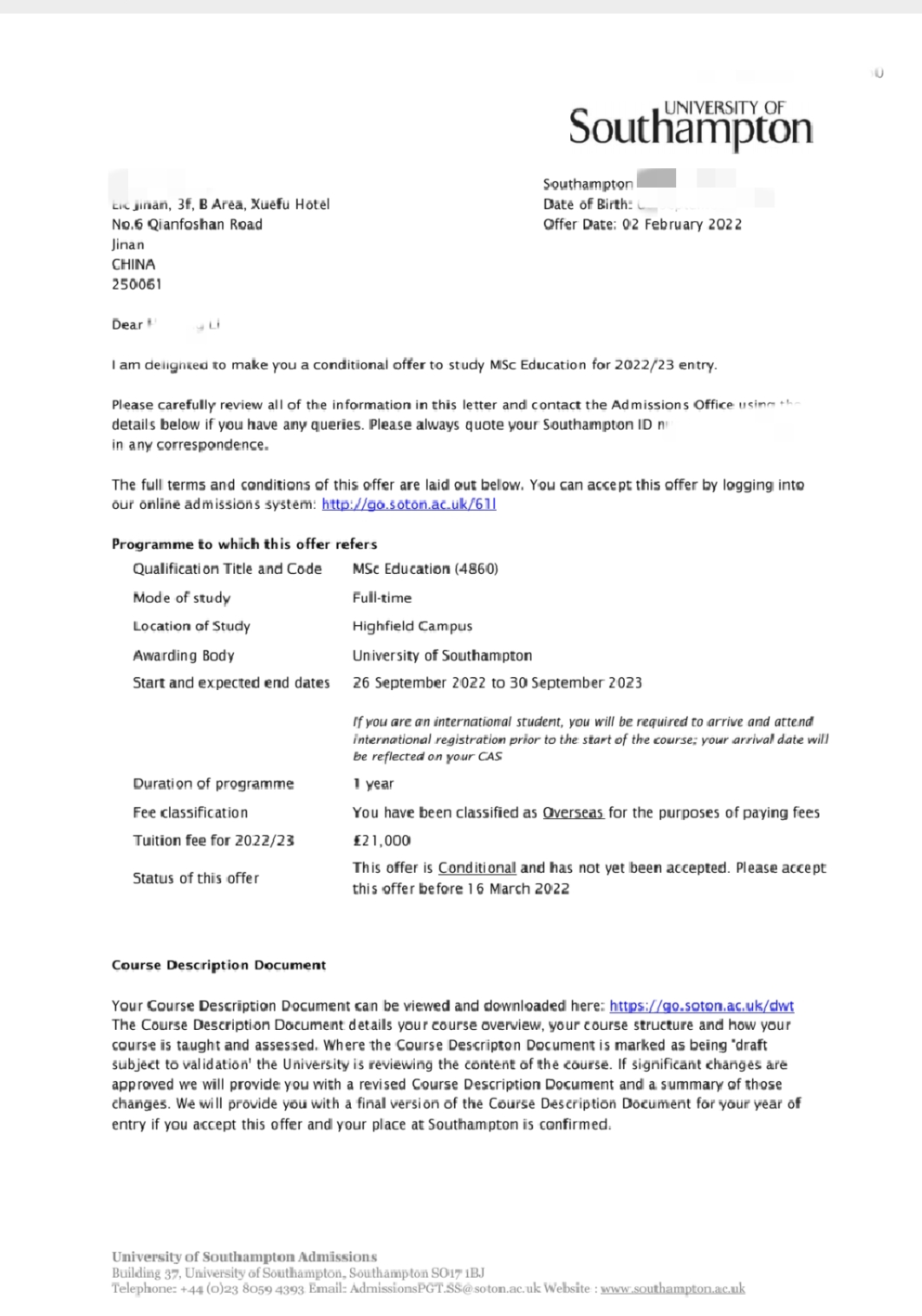 录取院校:南安普顿大学