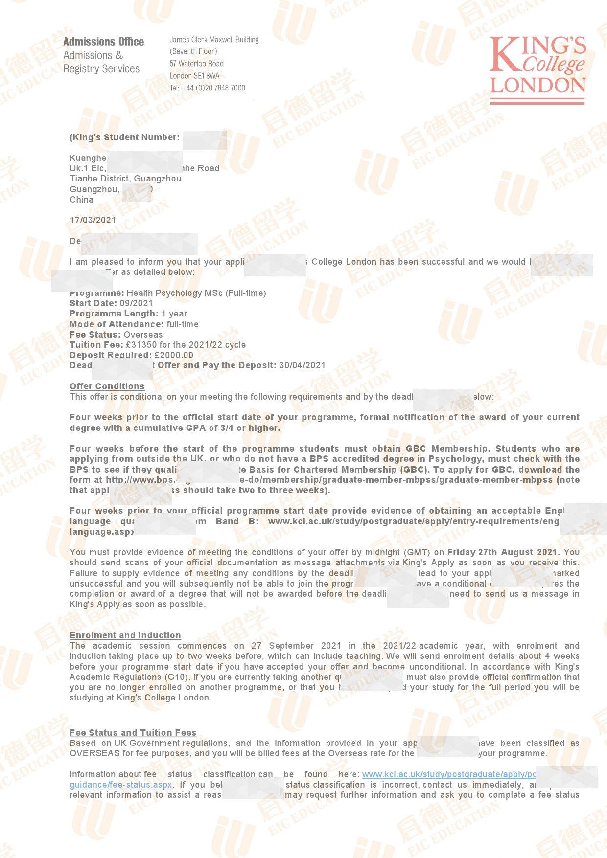 录取院校:伦敦大学国王学院