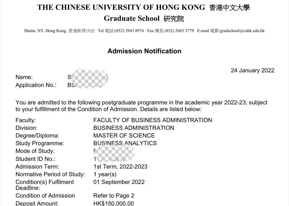 录取院校:香港中文大学