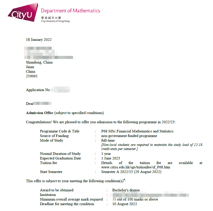 录取院校:香港城市大学