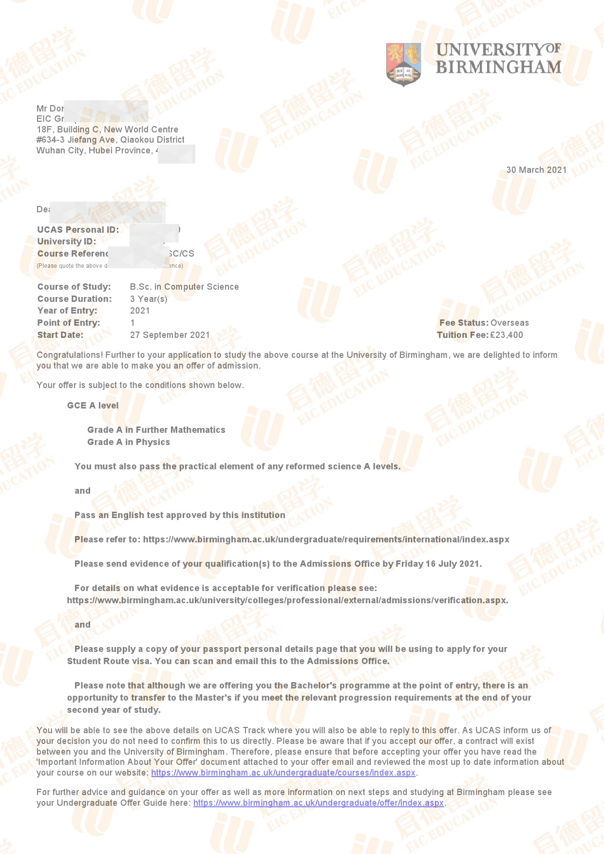 录取专业:Computer Science BSc