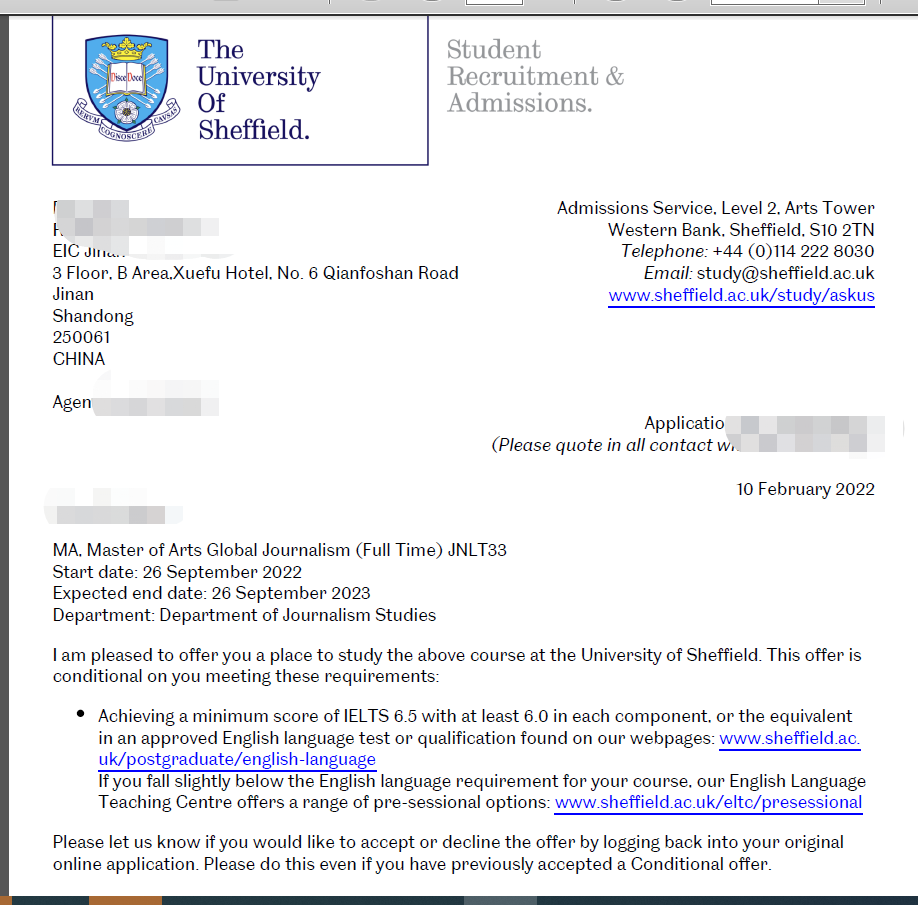 录取院校:谢菲尔德大学