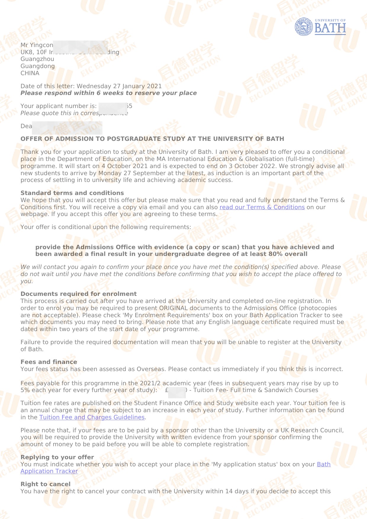 录取专业:MA International Education and Globalisation