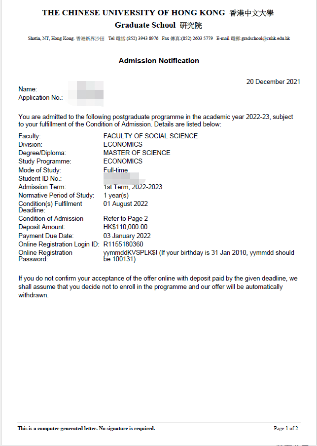 录取院校:香港中文大学