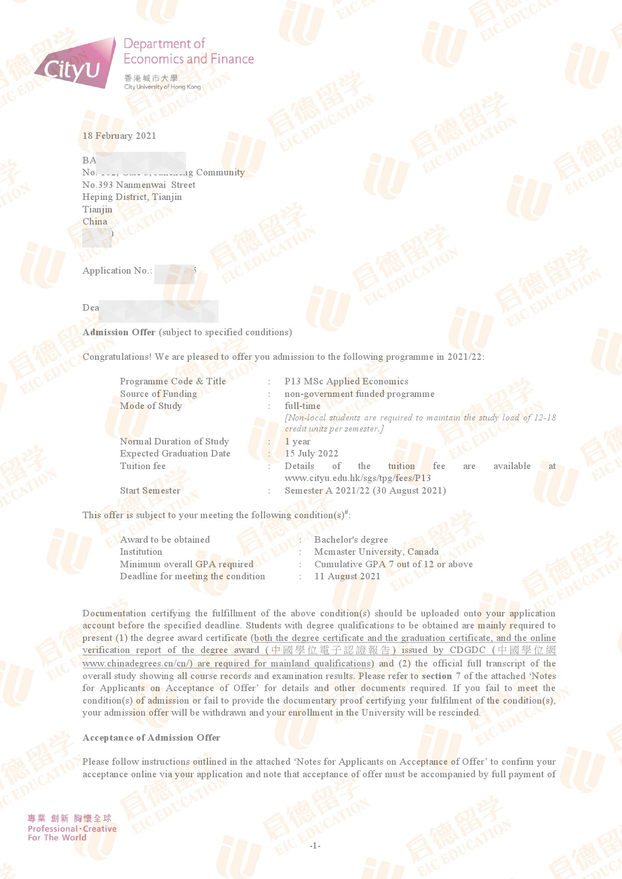 录取院校:香港城市大学