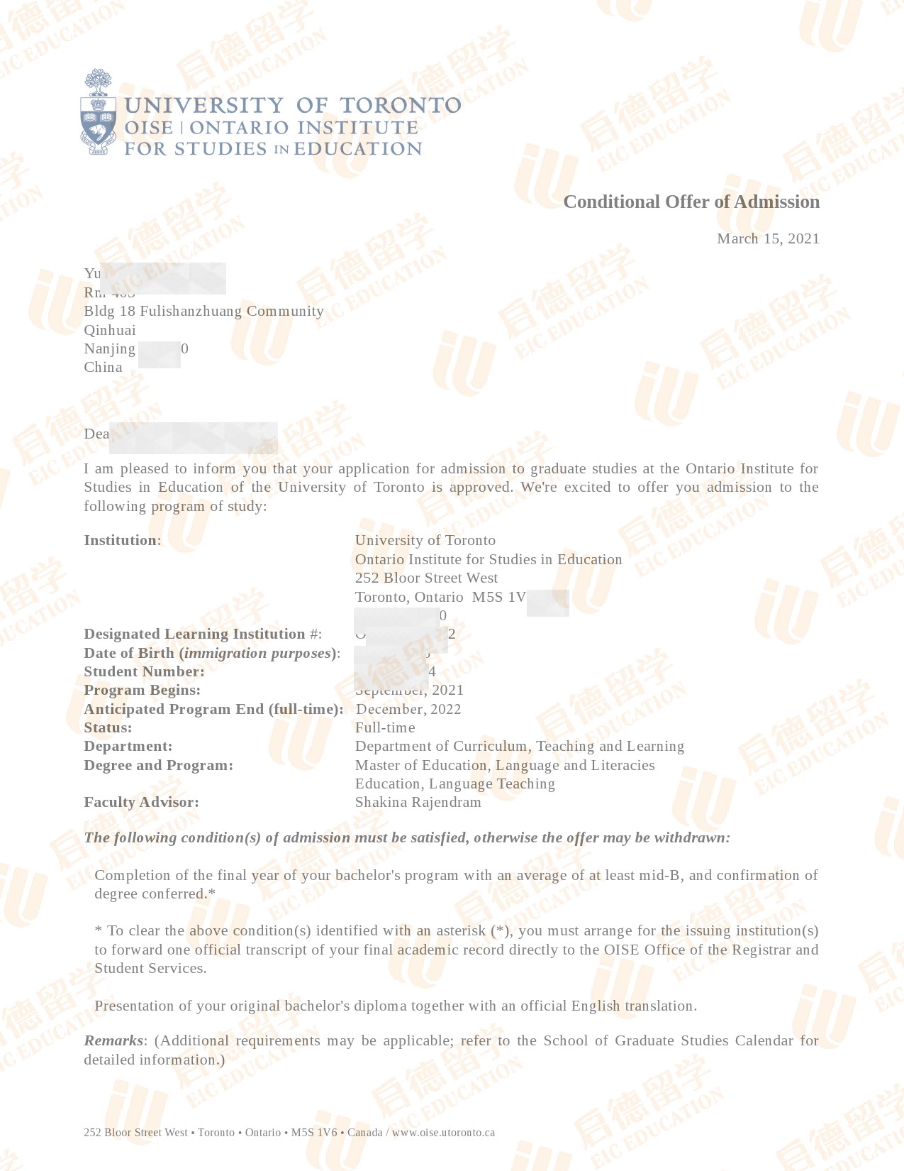 录取院校:多伦多大学