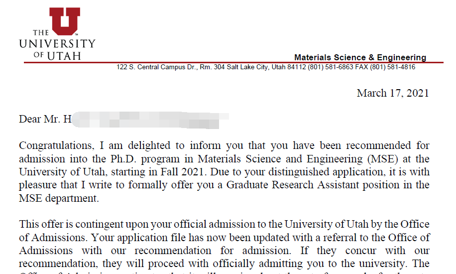 录取专业:PhD in Materials Science